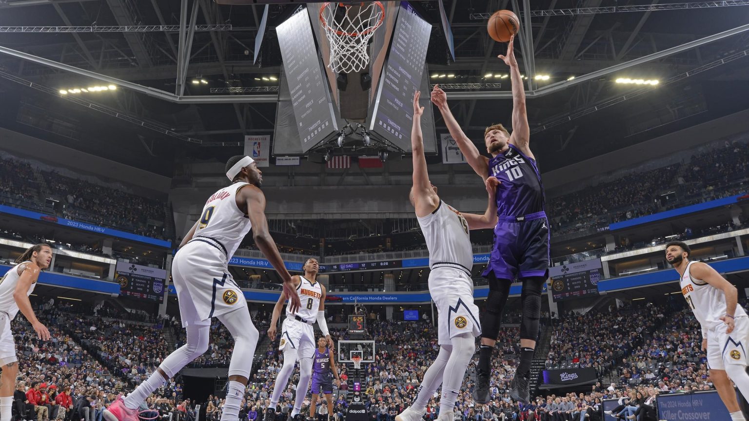 “ساعدت ثلاثية دومانتاس سابونيس فريق سكرامنتو كينغز على الفوز 135-106 على دنفر ناجتس في جولدن 1 سنتر. ويتصدر المركز الآن مع نيكولا يوكيتش كزعيم للثلاثية المزدوجة في الدوري الاميركي للمحترفين برصيد 16. 17 نقطة، 17 متابعات، و10 تمريرات حاسمة، في حين أن جهود يوكيتش لم تمنع فريقه ناجتس من الهزيمة، وأهدر ناجز فرصة الصعود إلى صدارة القسم الغربي.