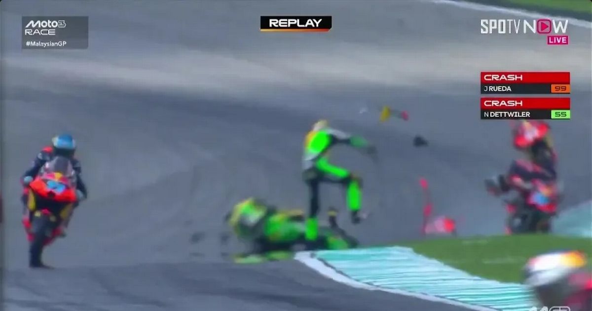 تعرض المتسابقان الإسباني خوسيه أنطونيو رويدا والسويسري نواه ديتويلر لحادث مروع أدى إلى تعطيل سباق جائزة ماليزيا الكبرى موتو 3 قبل اللفة الافتتاحية.