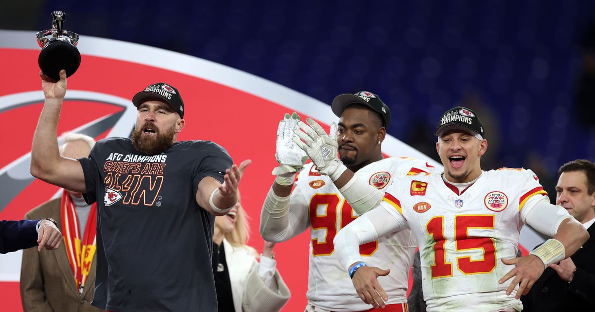 تغلب دفاع The Chiefs على لامار جاكسون وبالتيمور رافينز، ليحقق فوزًا بنتيجة 17-10 في ملعب بنك إم آند تي مساء الأحد. كان Mahomes هادئًا تحت الضغط، حيث أكمل 30 من 39 تمريرة لمسافة 241 ياردة وهبوطًا. أرسل هذا الفوز فريق Chiefs إلى Super Bowl للمرة الرابعة في خمسة مواسم. لعب Kelce أيضًا دورًا رئيسيًا، حيث قاد الزعماء في الاستلام بـ 11 عملية صيد لمسافة 116 ياردة والنتيجة. حتى أنه تجاوز الرقم القياسي لجيري رايس في دوري كرة القدم الأمريكية لما بعد الموسم والذي بلغ 151 حفل استقبال.