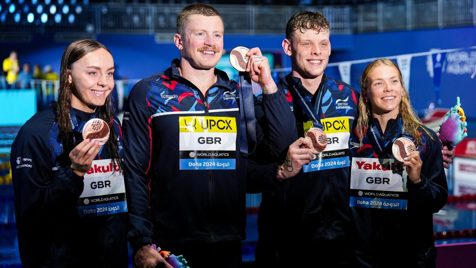 حجزت بريطانيا مكانًا لحصة التتابع في دورة الألعاب الأولمبية في باريس 2024 بحصولها على الميدالية البرونزية المختلطة في سباق 4 × 100 متر في بطولة العالم للألعاب المائية.