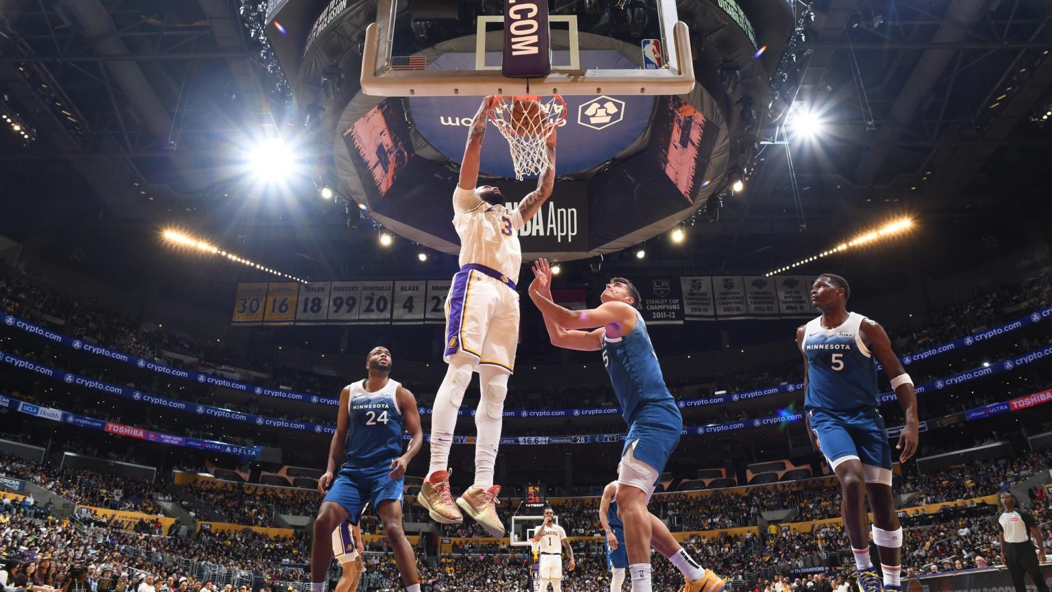 “سجل أنتوني ديفيس إحصائيات لم يسبق لها مثيل في الدوري الاميركي للمحترفين لإلهام لوس أنجلوس ليكرز للفوز 120-109 على مينيسوتا تمبروولفز. وأصبح أول لاعب يصل إلى 25 نقطة على الأقل، و25 كرة مرتدة، وخمس تمريرات حاسمة، وخمس تمريرات حاسمة”. يسرق ثلاث كرات في مباراة واحدة، بينما سجل ليبرون جيمس 29 نقطة من تلقاء نفسه.