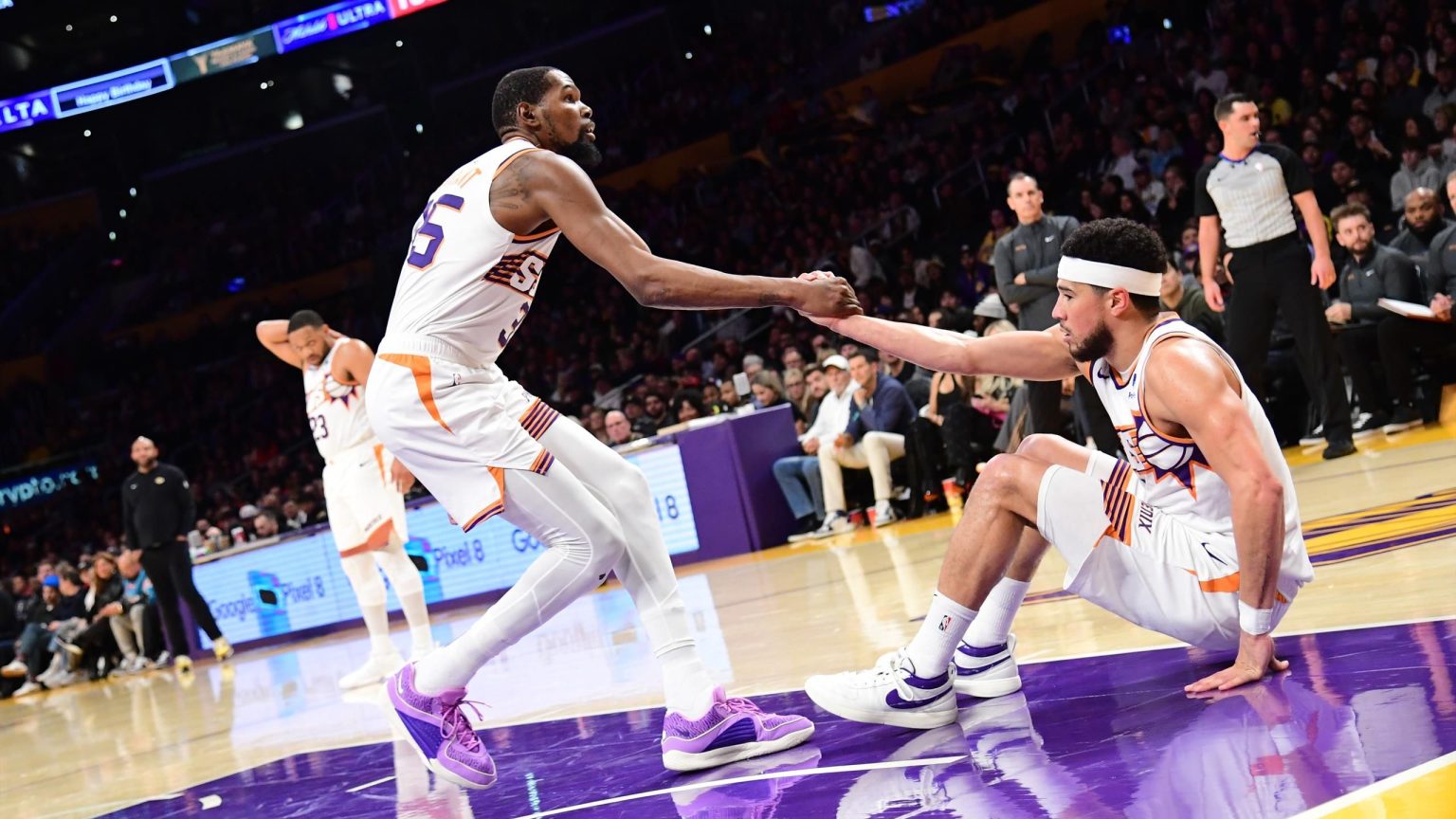“لقد عانى لوس أنجلوس ليكرز من حملة مروعة في الدوري الاميركي للمحترفين حتى الآن وسجل ليبرون جيمس 10 نقاط فقط لفريقه حيث تعرضوا لهزيمة أمام فينيكس صنز بفارق مقنع 127-109 ليلة الخميس. وكان ديفين بوكر وبرادلي بيل في المقدمة. “شكل استثنائي حيث ركز الفريق على رمياته الثلاثية وسجل كلا اللاعبين أكثر من 30 نقطة”.