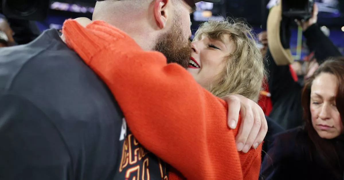 شوهدت تايلور سويفت وهي تقبل صديقها ترافيس كيلسي في الملعب بعد فوز فريق كانساس سيتي تشيفز على بالتيمور رافينز للوصول إلى سوبر بول LVIII في لاس فيغاس.