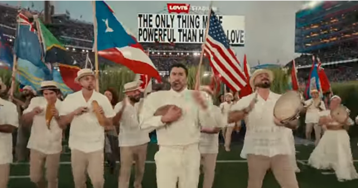 بالإضافة إلى ذلك، أنهى المؤدي بين الشوطين العرض بلافتة على الشاشة كتب عليها: “الشيء الوحيد الأقوى من الكراهية هو الحب”، بينما سار خلفه أعلام مختلفة لتمثيل السكان المهاجرين في الولايات المتحدة.
