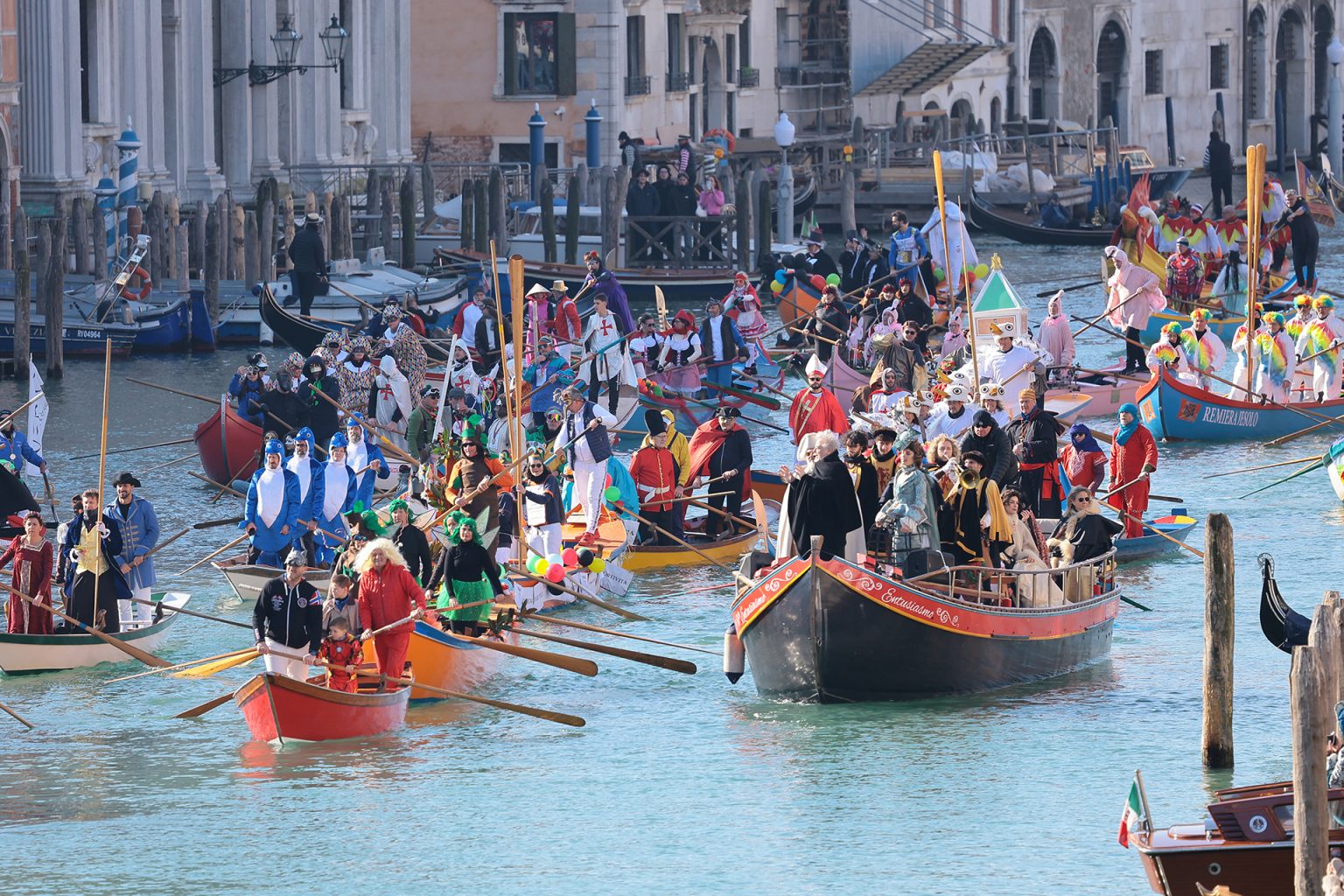 dpatop - FILED - The 2026 Venice Carnival will take place through to February 17 2026. Here, masked water parade by the Coordination of Venetian Rowing Associations. Around a hundred boats, led by the legendary Pantegana, take to the water, ready to explode with music and confetti in front of the Rialto Bridge. Photo: Matteo Chinellato/IPA via ZUMA Press/dpa